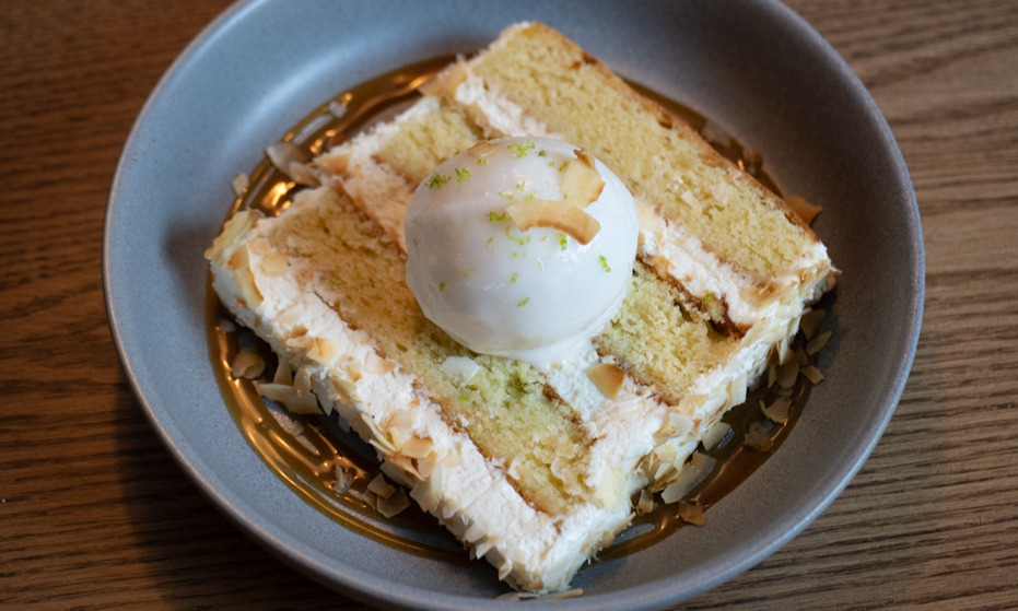 coconut lime sorbet, cream cheese frosting, caramel sauce