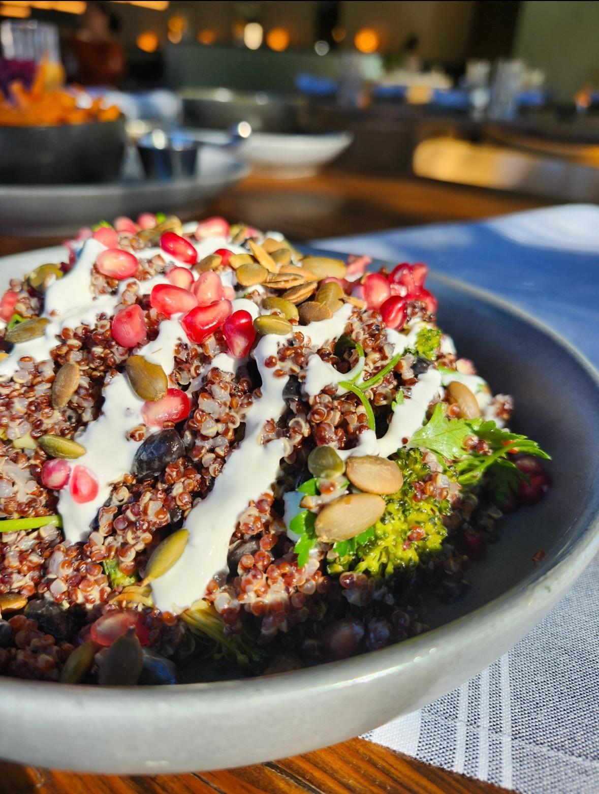black bean, roasted broccoli, pomegranate seed, pepitas, fresh parsley, lime crema